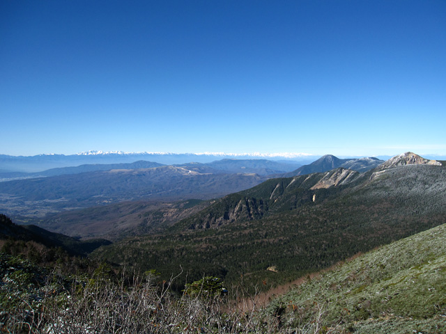硫黄岳から横岳へ向けた稜線と、その先に赤岳