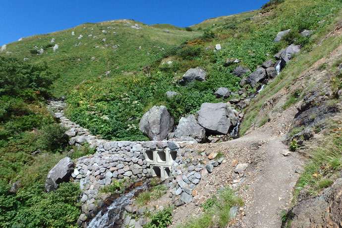 砂防新道は御前峰まで道は綺麗に整備されベンチも沢山あって、途中水場や小屋があり飽きさせないため標高差1,500mもあるのに全然感じさせない。5歳の子供でも登って来ていた。