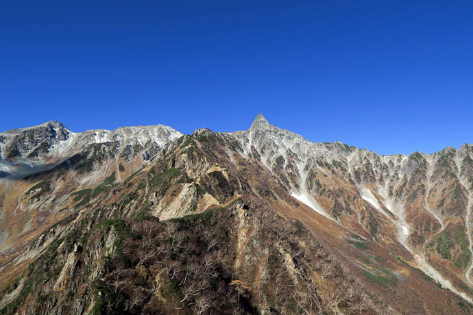 西岳方面に少し進むと槍の穂先が見えて来た。