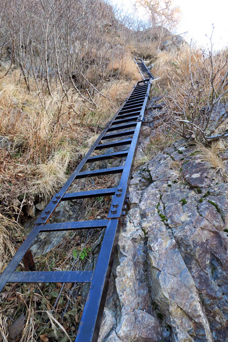 ココからメインルートの槍沢から離れ水俣乗越を目指して急登を登り始める。1時間強で水俣乗越到着。冬対策で道標がブルーシートでグルグル巻きになっていた。左に行けば槍に向けた東鎌尾根、まっすぐ進めば北鎌出会いに出る天上沢で右に進めばヒュッテ西岳に出る。今回の目的地はヒュッテ西岳近くの赤沢山と赤岩岳を登るので右に進む。ガレた場所や梯子の急登を登り9:30ヒュッテ西岳に到着した。