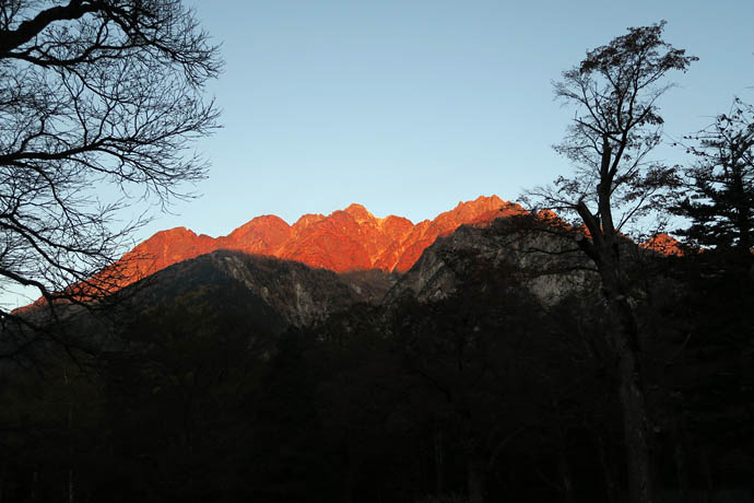 ヘッデンを点けてまずは横尾を目指して林道を歩き始める。気温は0℃位か?かなり冷えている。45分ほど歩いて横尾到着。トイレが新設されていました。写真を撮ったらスグに出発し次の目的地槍沢ロッジに向かう。出発して2時間弱の6:56槍沢ロッジに到着。更に進み7:20ババ平到着。ココも新しいトイレが設置されてました。大曲の水俣乗越分岐7:40到着。ココまで2時間40分でまあまあのペース。