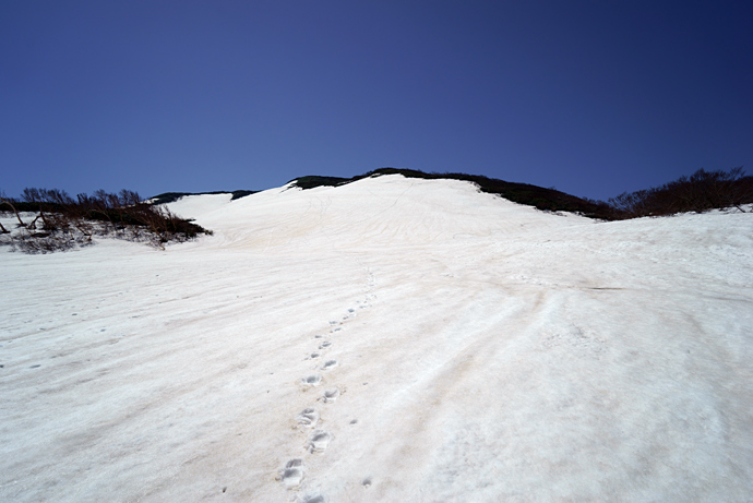 朳差岳に向けて雪面を歩く。