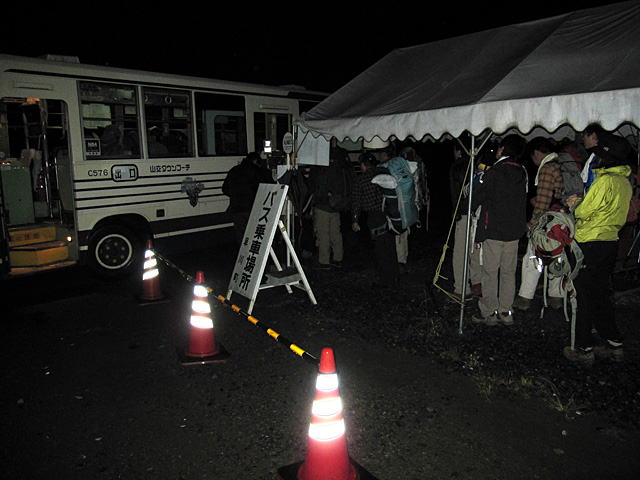 悔やんでいても仕方ないので、朝飯を食べて登山準備をし暗い中バスの列に並ぶ。
